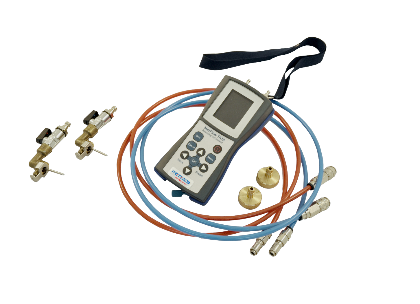 De Metflow TA10 werkt op een oplaadbare accu en wordt geleverd als complete meetset. De set bestaat doorgaans uit meetslangen, meetnaalden, oplader, USB-adapter en handleiding, verpakt in een stevige transportkoffer voor veilig gebruik op locatie.