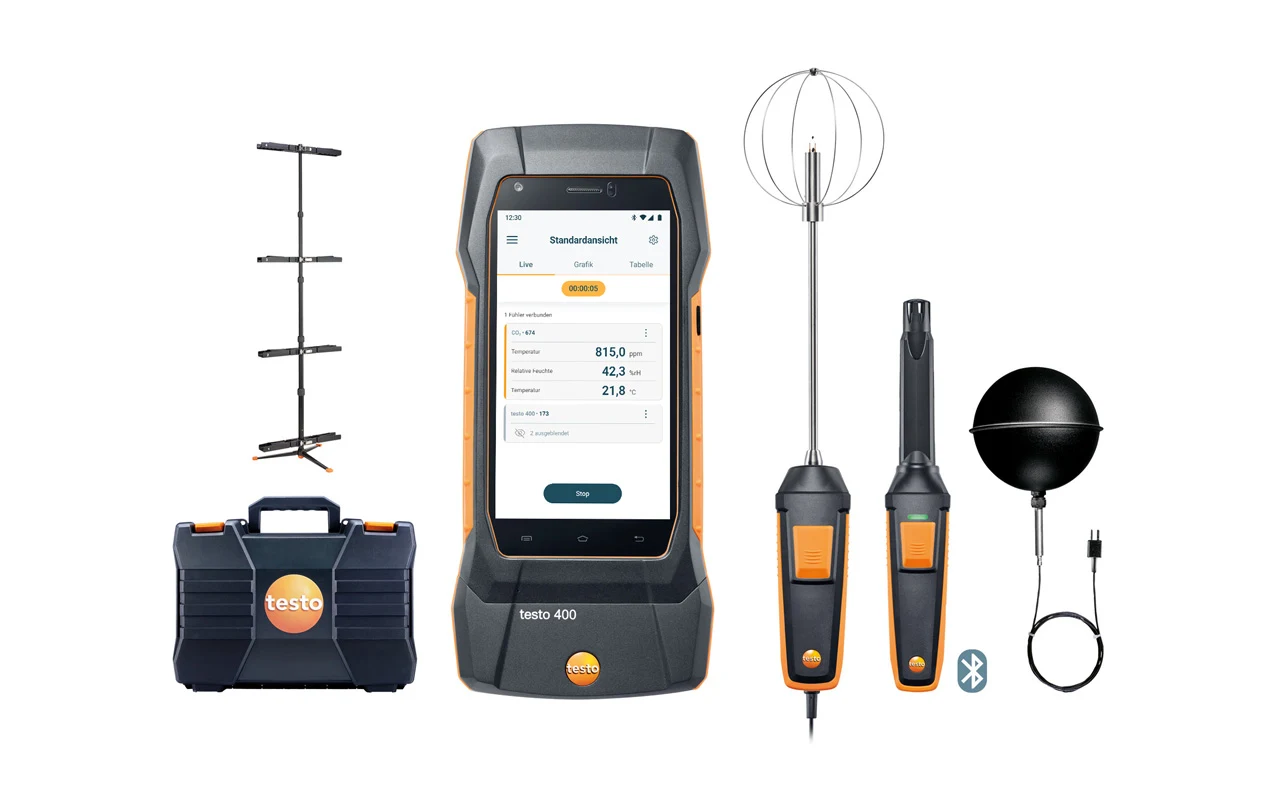 De set wordt compleet geleverd met het Testo 400 meetinstrument, een CO₂-sonde met temperatuur- en vochtmeting, een turbulentiegraad-sonde, een globe-thermometer en een statief. De meegeleverde transportkoffer zorgt voor veilige opslag en eenvoudig transport. Neem contact op met Metesco over de beschikbaarheid van deze set of advies over de toepassing ervan voor uw project.