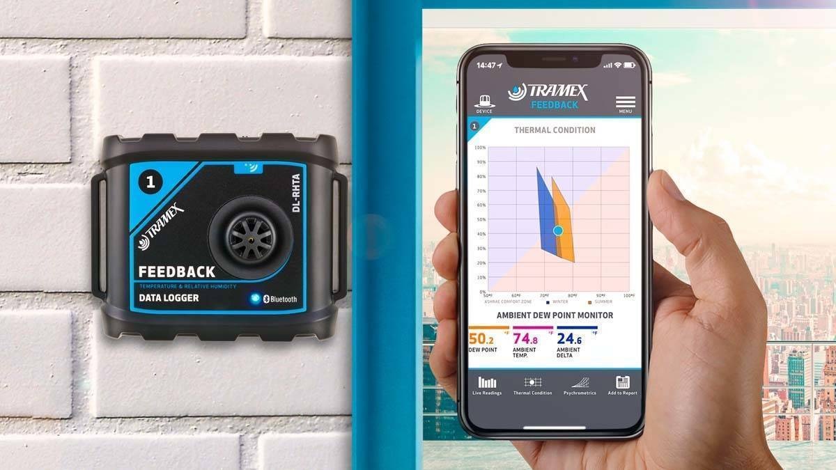De Tramex Feedback datalogger registreert meetwaarden voor relatieve vochtigheid, temperatuur, dauwpunt en grains per pound. De nauwkeurige resultaten worden gevisualiseerd met behulp van de app op uw smartphone of tablet.