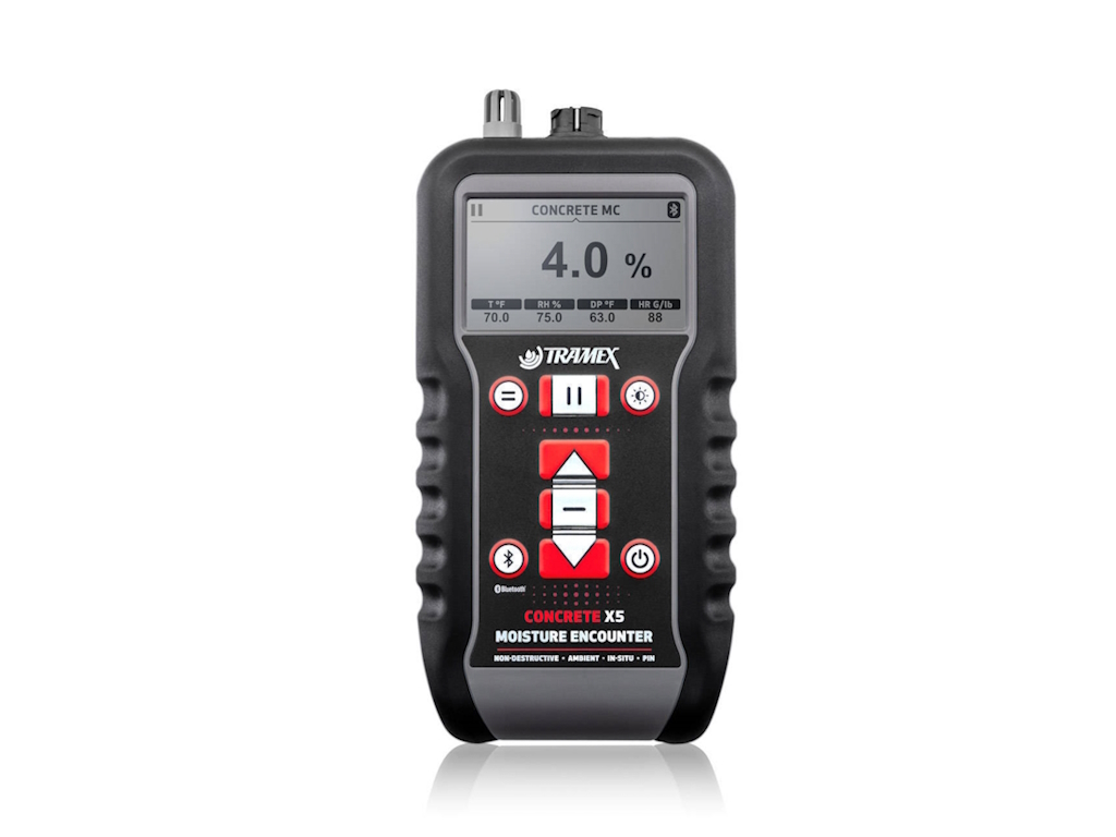 De Tramex Concrete Moisture Encounter X5, de vernieuwde CMEX2 betonvochtmeter, is een niet-destructieve digitale betonvochtmeter voor het meten van kwantitatief vochtgehalte in betonnen vloeren en platen. De Concrete Moisture Encounter X5, CMEX5, heeft ook een relatieve vochtigheidsmeterfunctie omdat hij een ingebouwde hygrometer heeft die de relatieve vochtigheid, temperatuur, dauwpunt en vochtigheidsratio (of mengverhouding) van de omgeving meet. Een bajonet plug-in poort zorgt voor optionele houten pin sondes of Tramex Hygro-i2 relatieve vochtigheidssensoren voor het meten van relatieve vochtigheid in beton volgens ASTM F2170.