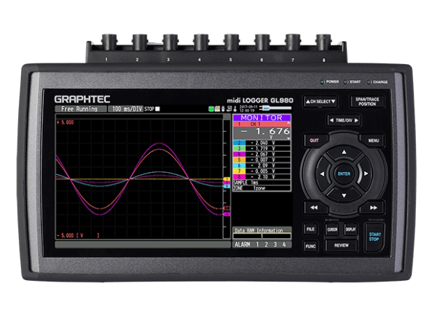 De Graphtec GL980 is de nieuwe 8-kanaals datalogger voor het loggen van verschillende grootheden op zeer hoge snelheid. Het instrument is specifiek geschikt voor het meten van spanning tot 500 V DC, maar ook voor temperatuur (thermokoppels), luchtvochtigheid, Pulse en Logic signalen wordt dit instrument ingezet.